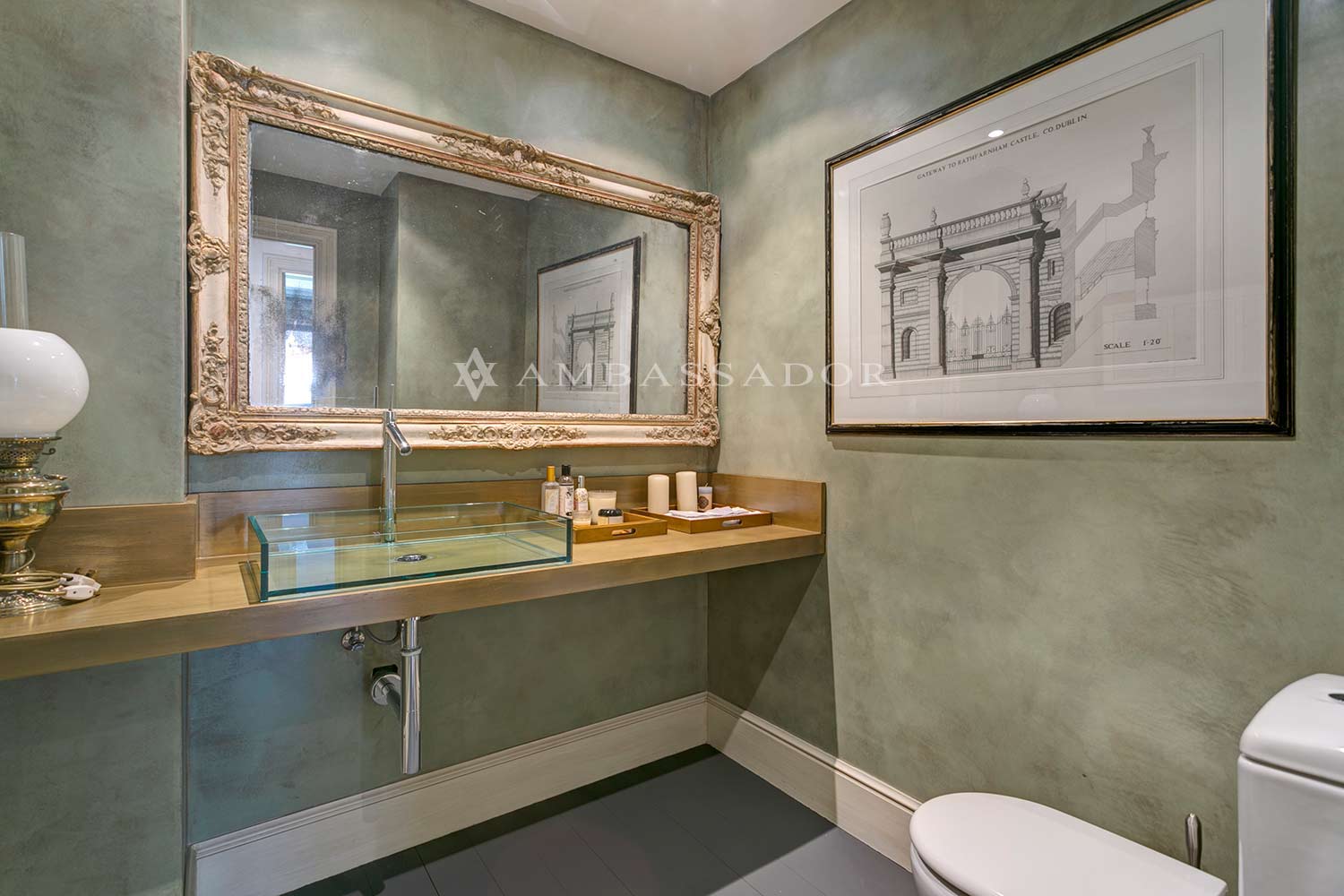 El aseo de visitas luce acabados en estuco en paredes y una elegante encimera volada en piedra natural, sobre la que descansa un lavabo de diseño en cristal, a juego con la grifería. |