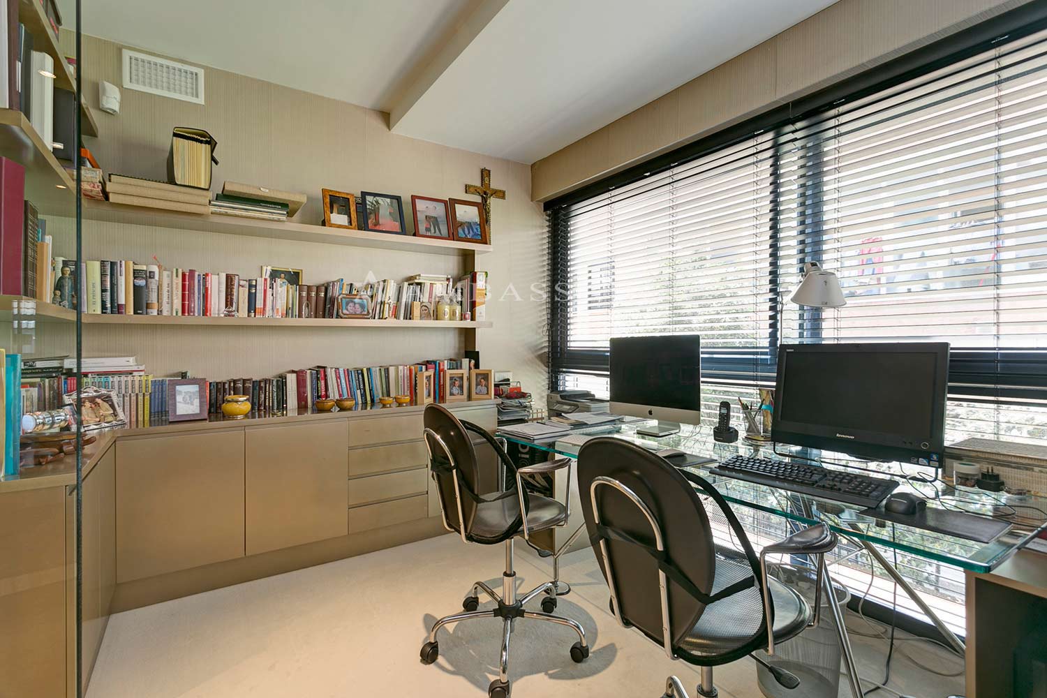La zona de armarios desemboca en este elegante despacho independiente, al que se accede a través de una puerta de cristal. Cuenta con un imponente ventanal y estanterías de obra. |