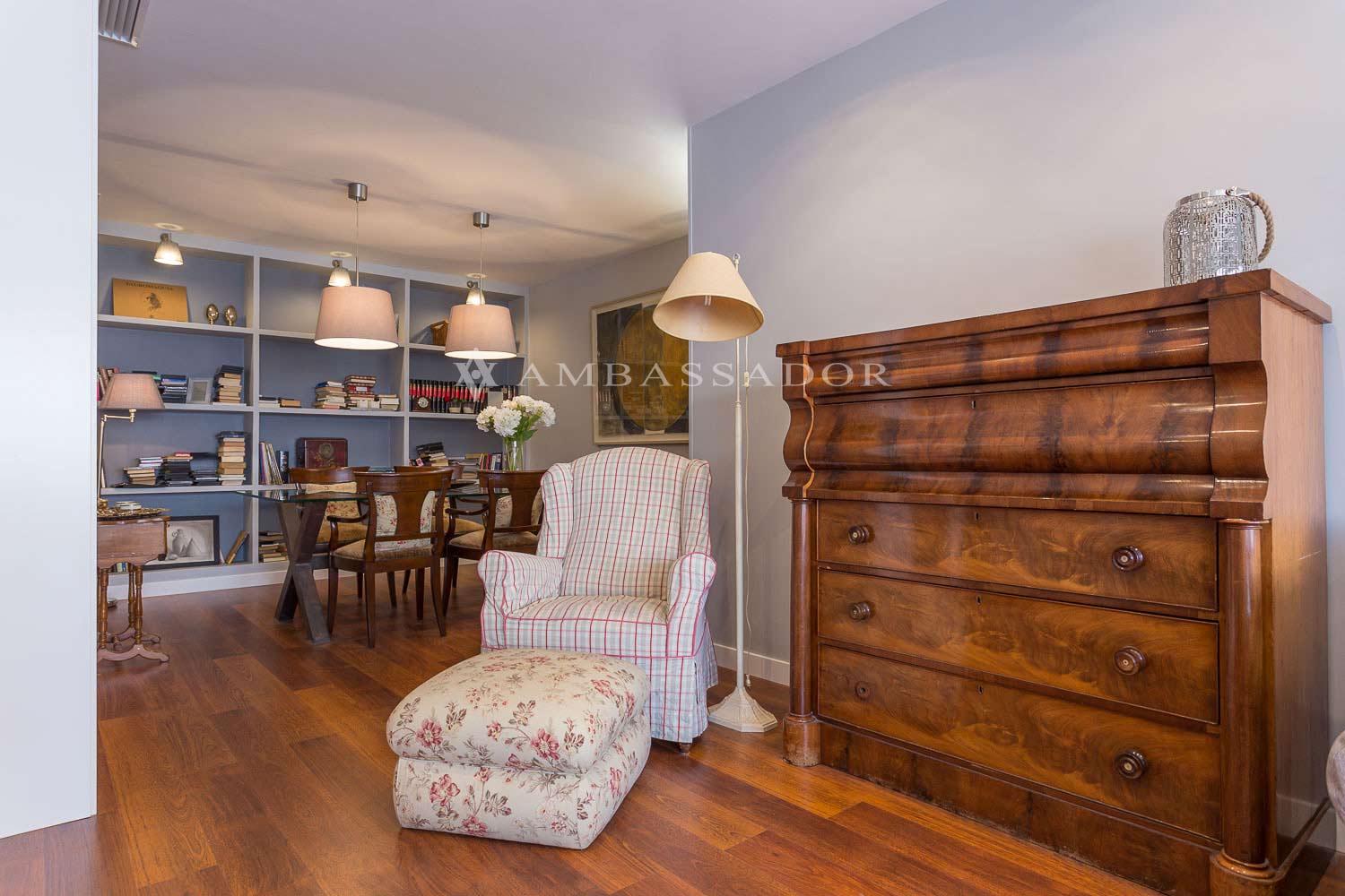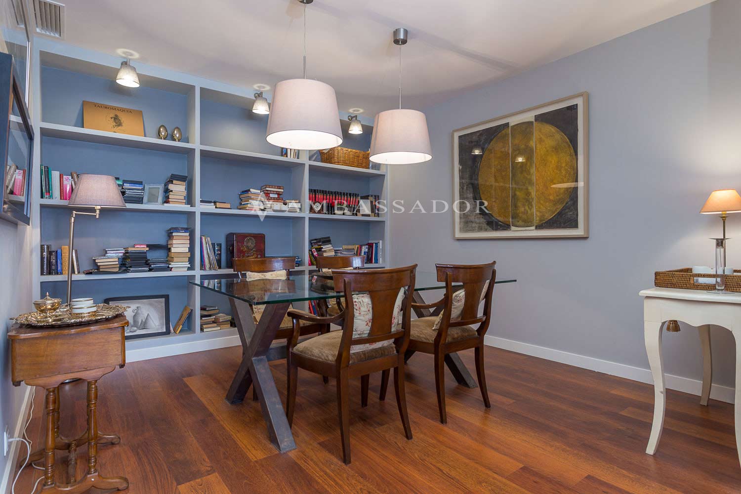 El comedor, como se puede apreciar, es una zona amplia con una cuidad iluminación sobre la mesa de comedor y una funcional librería realizadas a medida en una de las paredes. |